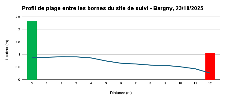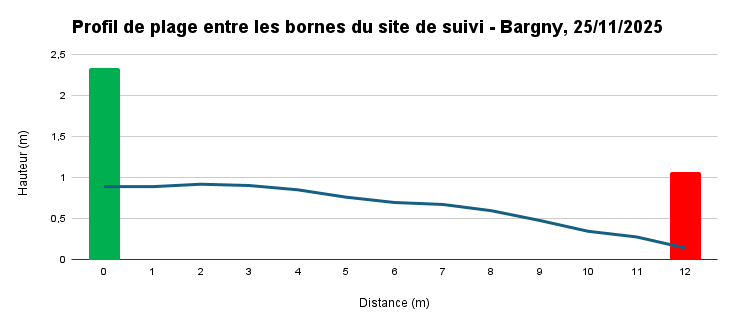 Les profils de plage sont réalisés sur le même transect perpendiculaire au trait de côte, délimité par deux bornes fixes distantes de 12 mètres. Cette méthode permet de mesurer avec précision la topographie de la plage et d’évaluer l’évolution du littoral sur une section définie, servant de référence pour les suivis futurs.