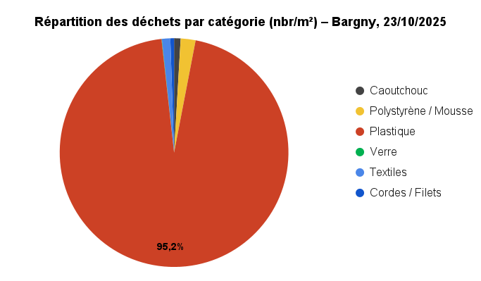 Les déchets marins sont collectés sur une zone fixe de 410 m², s’étendant du haut de la dune jusqu’au bas de l’estran. Ils sont ensuite triés et classés selon leur type et leur catégorie, afin d’évaluer la composition et la répartition des déchets sur cette portion du littoral.