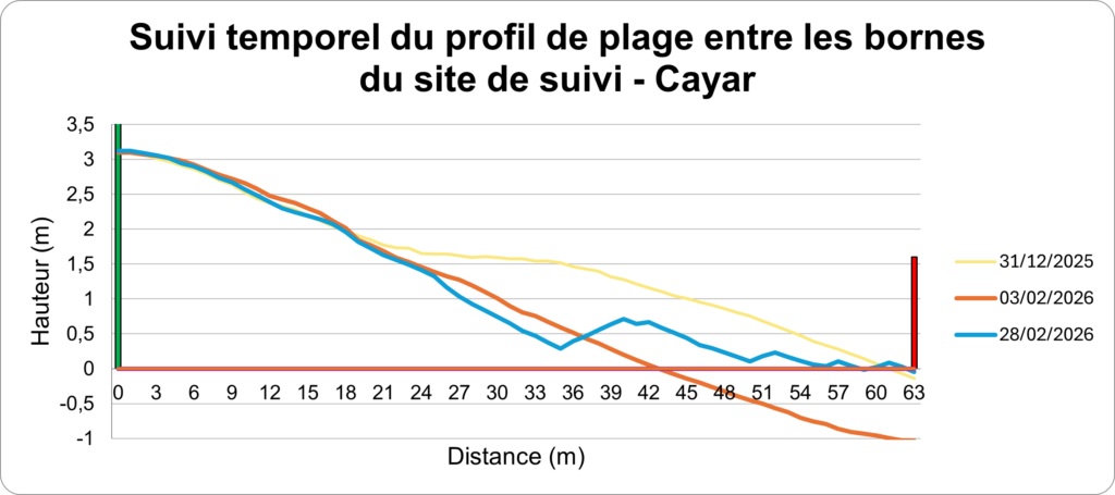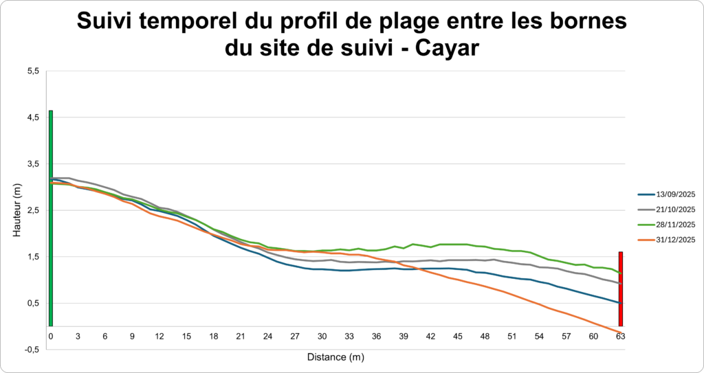Les profils de plage sont réalisés sur le même transect perpendiculaire au trait de côte, délimité par deux bornes fixes distantes de 63 mètres. Cette méthode permet de mesurer avec précision la topographie de la plage et d’évaluer l’évolution du littoral sur une section définie, servant de référence pour les suivis futurs.