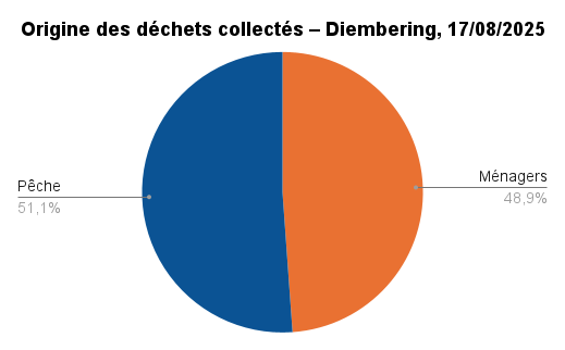 La campagne du 17 août 2025 constitue le premier suivi participatif à Diembering, servant d’état initial de référence pour ce site. La collecte a été réalisée par les observateurs locaux, sous la supervision de l’équipe de l’assistance technique, qui a ensuite validé les données dans le cadre de la mise en place de l’ONL. Au total, plus de 37 kg de déchets ont été collectés lors de cette première opération.