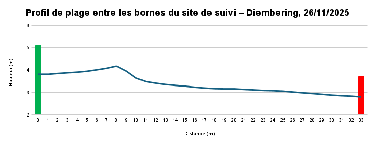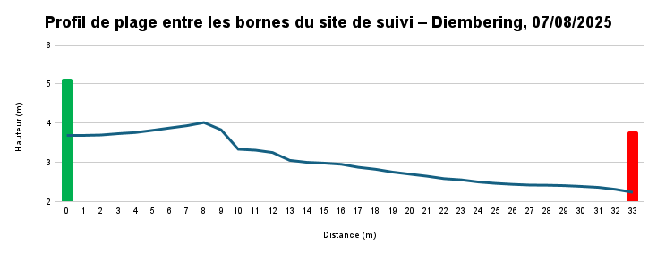 La campagne du 17 août 2025 marque le premier suivi participatif réalisé à Diembering, servant d’état initial de référence pour ce site. La collecte des données a été assurée par les observateurs locaux, puis validée par l’équipe de l’assistance technique dans le cadre de la mise en place de l’Observatoire National du Littoral (ONL). Le profil de plage a été relevé sur un transect délimité par les deux bornes fixes.