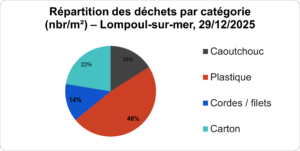 Les déchets marins sont collectés sur une zone fixe de 2600 m², s’étendant du haut de la dune jusqu’au bas de l’estran. Ils sont ensuite triés et classés selon leur type et leur catégorie, afin d’évaluer la composition et la répartition des déchets sur cette portion du littoral.