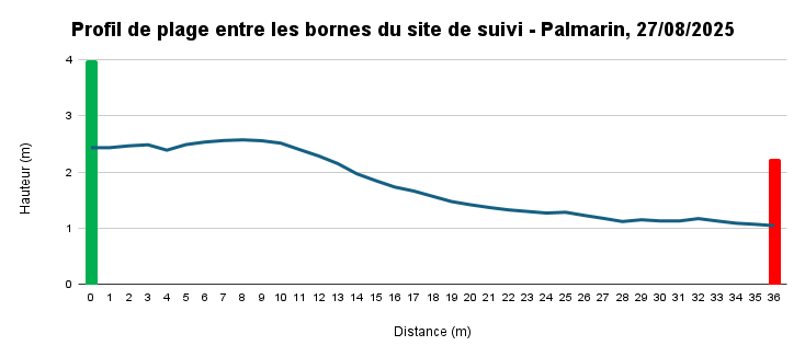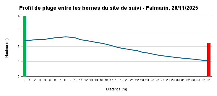 Les profils de plage sont réalisés sur le même transect perpendiculaire au trait de côte, délimité par deux bornes fixes distantes de 36 mètres. Cette méthode permet de mesurer avec précision la topographie de la plage et d’évaluer l’évolution du littoral sur une section définie, servant de référence pour les suivis futurs.