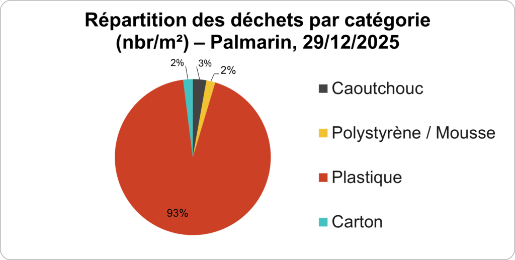 La campagne du 29 décembre 2025 constitue le deuxième suivi participatif à Palmarin. La collecte des données a été assurée par les observateurs locaux, puis validée par l’équipe de l’assistance technique dans le cadre de la mise en place de l’ONL. Au total, plus de 149 kg de déchets ont été collectés lors de cette opération.