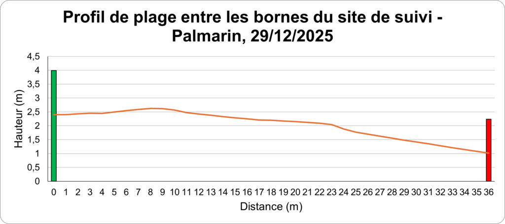Les profils de plage sont réalisés sur le même transect perpendiculaire au trait de côte, délimité par deux bornes fixes distantes de 36 mètres. Cette méthode permet de mesurer avec précision la topographie de la plage et d’évaluer l’évolution du littoral sur une section définie, servant de référence pour les suivis futurs.