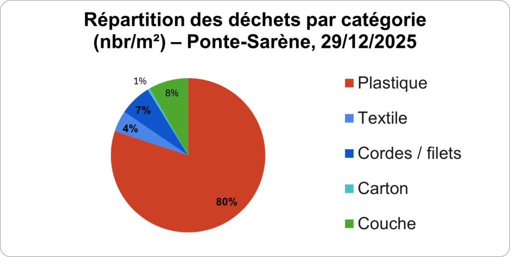 La campagne du 29 décembre 2025 constitue le deuxième suivi participatif à Pointe Sarène. La collecte des données a été assurée par les observateurs locaux, puis validée par l’équipe de l’assistance technique dans le cadre de la mise en place de l’ONL. Au total, plus de 41 kg de déchets ont été collectés lors de cette opération.
