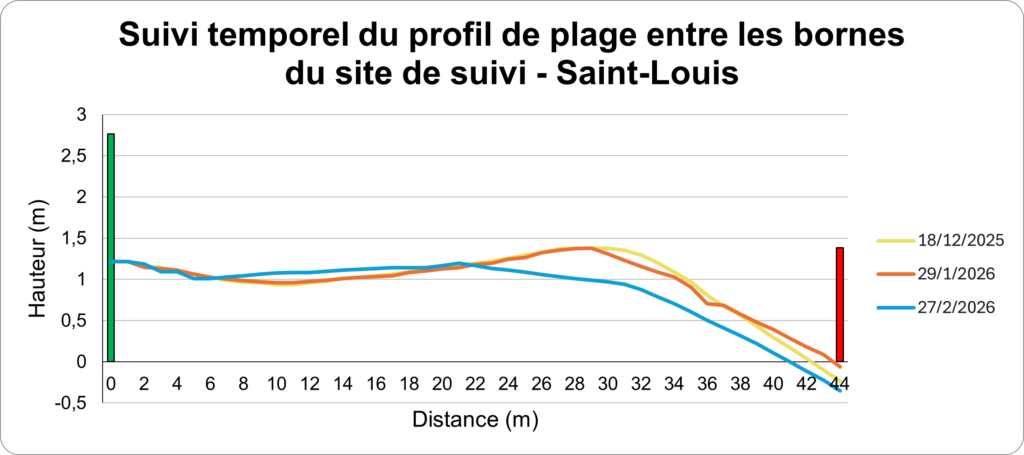 Le profil présente trois parties : une pente descendante vers la plage sur environ 10 mètres, une zone de remontée jusqu’à environ 38 mètres pour les deux premiers suivis (30 mètres pour les deux derniers), puis une pente raide jusqu’à la borne rouge.