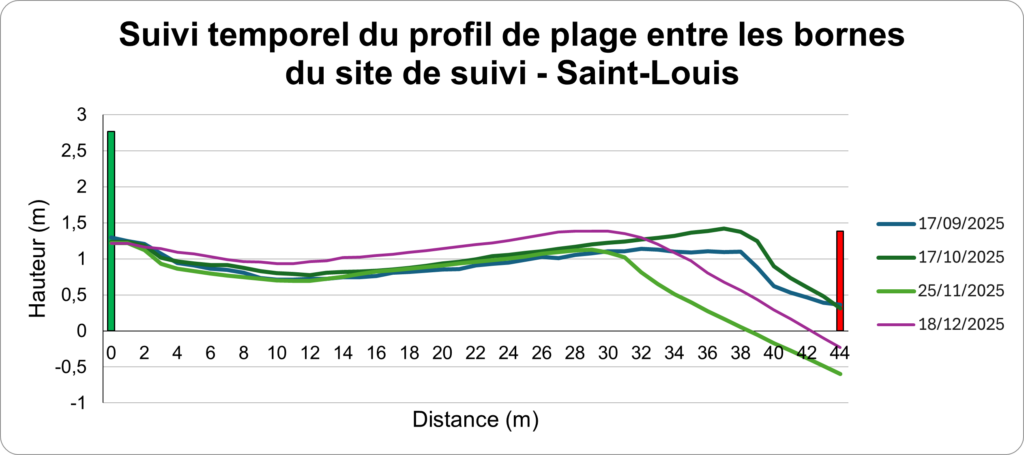 À partir de novembre, la rupture de pente apparaît plus tôt et la pente devient plus raide jusqu’à la borne rouge, indiquant une perte de sable sur cette zone.